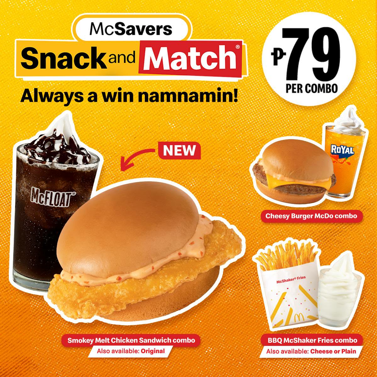 McSavers Snack and Match is available via Front Counter, Take-Out, SOK, and Drive-Thru only. Meanwhile, the Smokey Melt Chicken Sandwich is also available in other meal types via Front Counter, Take-Out, Self-Ordering Kiosks, Drive-Thru, McDelivery, and 3POs.